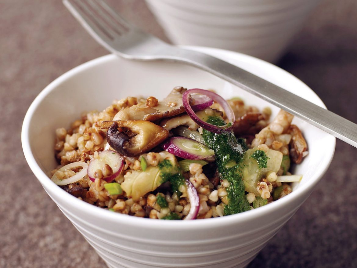 5. Trong tô lớn trộn Kiều mạch mục (2) + hành lá xắt nhuyễn + củ thì là thái lát + 30 gr ngò tây thái nhuyễn + sauce (4), nêm tí muối. Cho ra đĩa, cho nấm ở mục (3) lên trên trang trí với nhánh ngò tây nhỏ cho đẹp.